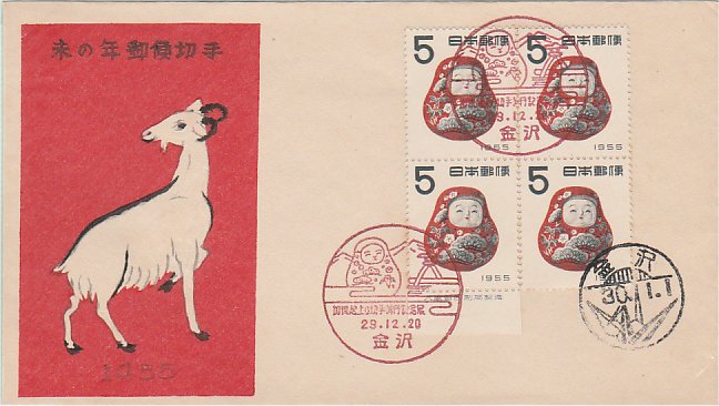 起き上がり田貼 29.12.20発行 金沢記念印+30.1.1金沢年賀活印