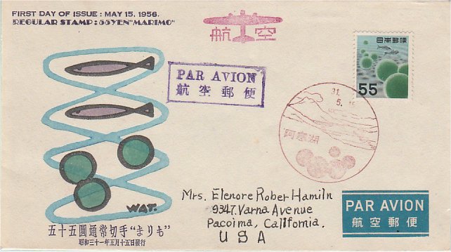 55円まりも 31.5.15発行 阿寒湖風景印 航空便