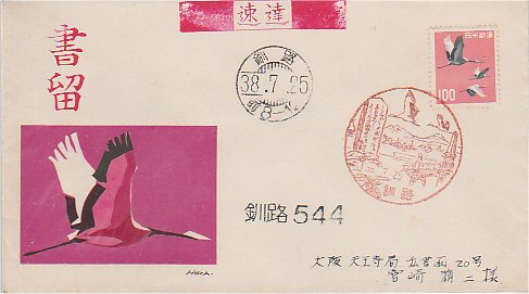 100円丹頂づる 38.7.25発行 釧路風景印、活印