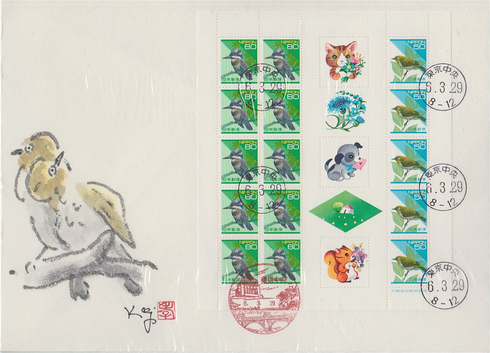 ふみの日ペーン、41円P,62円P,s/s貼 3.7.23発行 京都中央特、小型、活印 藤井肉筆
