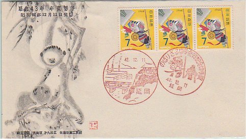 さる3連貼 43.12.11発行 延岡風、小型印 5色刷